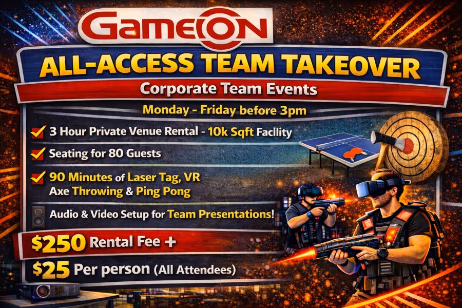 Renting Game On as an off-site business meeting venue can provide a unique and engaging atmosphere for your team. Access to audio and visual that can enhance your meeting experience. It can serve as a fun team-building activity and a way to encourage creativity and problem-solving skills. Hosting an event at Game On can also be a great way to boost morale and build stronger relationships among colleagues. Submit a quote request today!